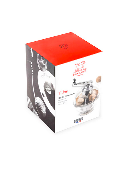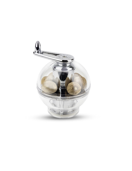 Les grands chefs et amateurs de cuisine le savent : rien de tel qu'une pincée de noix de muscade fraîchement moulue pour rehausser subtilement un plat sucré ou salé. Le moulin à muscade Peugeot "Tidore" est particulièrement ingénieux. Il permet grâce à sa griffe puissante et à un duo lame-râpe tournant simultanément de râper très finement la noix de muscade. Il vous suffit ainsi de tourner la manivelle pour profiter de toutes les saveurs de la muscade, sans risque pour vos doigts. Bien pensé, il est équipé d’un réservoir qui permet de conserver à l’abri 7 à 8 noix. Son design tout en rondeur évoque les courbes d’une noix de muscade. Entièrement transparent, intemporel, le moulin Tidore s’harmonisera facilement à la décoration de votre cuisine.
