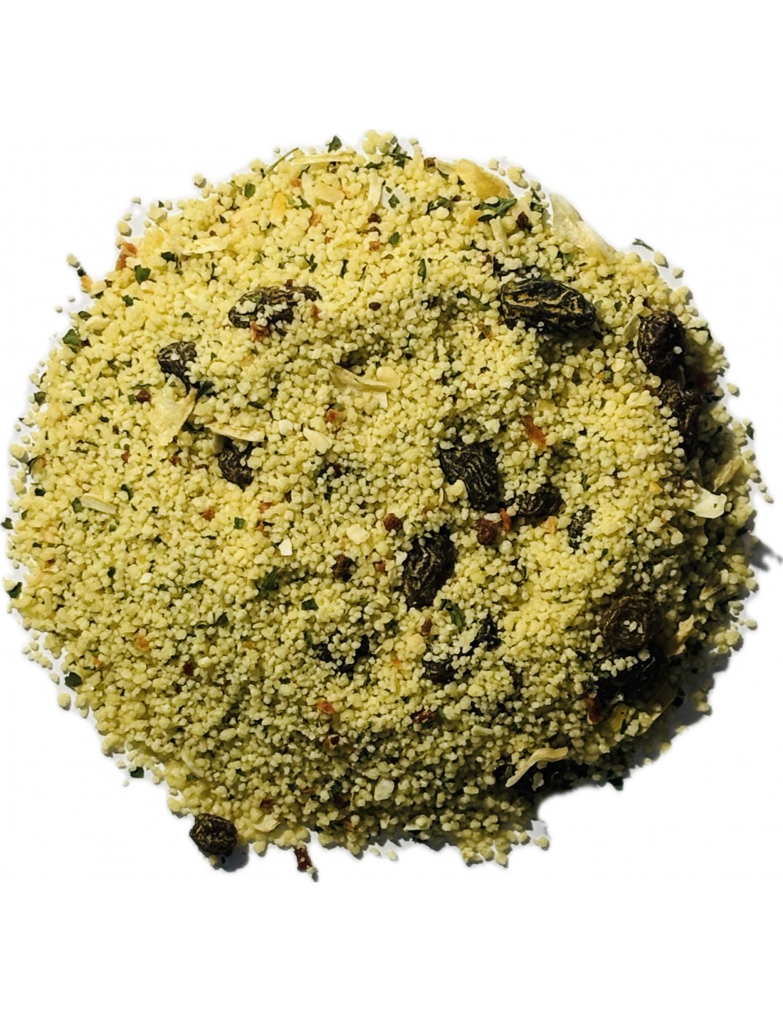 Couscous français, raisins, fenugrec, coriandre, persil, paprika fort, ail, carvi, gingembre, fenouil, cumin, poivre, curcuma, sel, oignon, ail, poivron, persil, carotte