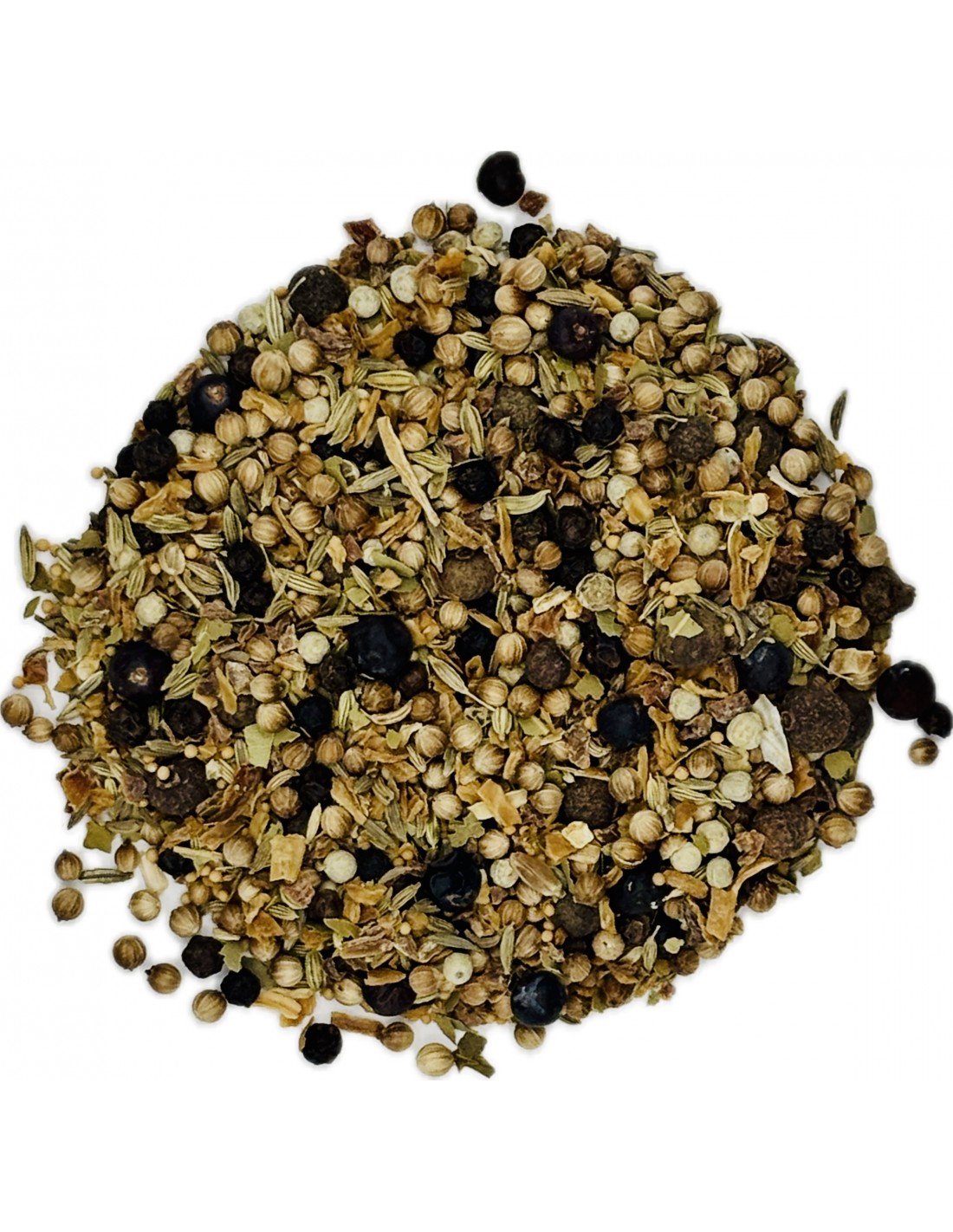 Coriandre, moutarde blonde, poivre blanc et noir, carotte, fenouil, oignon, piment de la Jamaique, genièvre et laurier